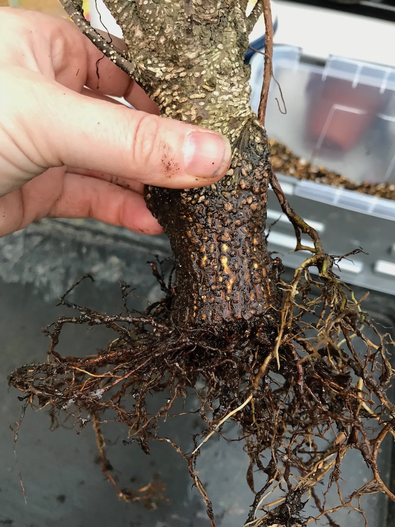 At the time of re-potting I will also prune the roots, taking off any damaged roots, trimming all the roots back and selecting those to develop a better nebari and root pad where possible. I tend to remove less than one third of the overall roots at this stage but it does depend on how established the Ficus is and how much root their is to start with. I prefer to grow my Ficus in deeper pots as this allows for greater moisture regulation and temperature as well as growth for where I keep my bonsai in a heated conservatory during the colder months. You can use shallow pots as these allow greater root flare as roots disperse over wider area but they do dry out quicker. Many Ficus for bonsai are produced by air layering in their native climate so often will need time to develop a good root system.