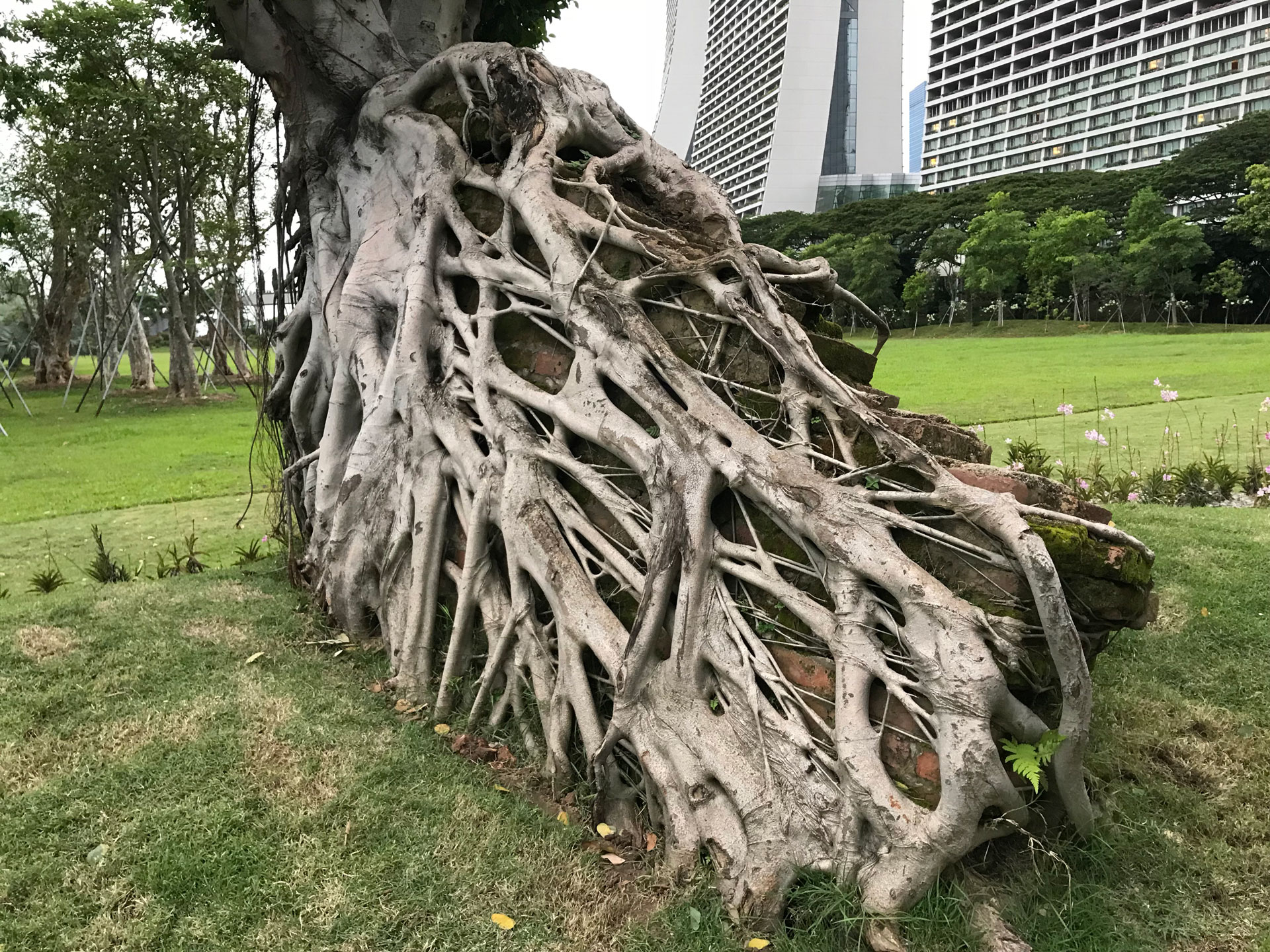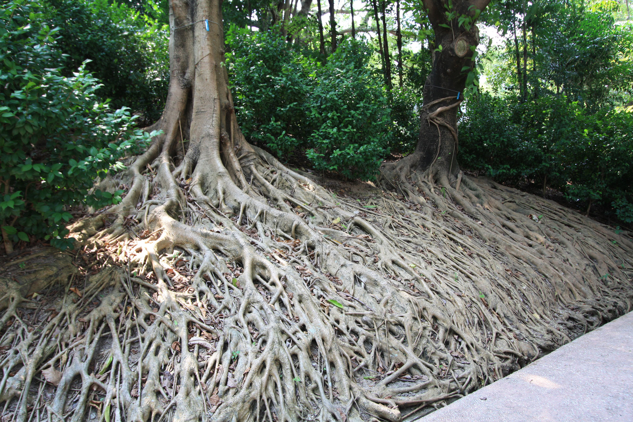 This Trident Maple started life as a cutting purchased in 1988 for 50 pence. It was planted in a length of drain pipe for two years to help develop long roots, during this time it was fed well. It was then taken out of the pipe, all the soil washed off, sat on this piece of stone and tied in place with Raffia. The roots were laid out and any surplus ones wound round or tied to others. It was then planted in my front garden, during this time the height of the tree was not reduced.